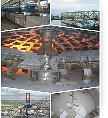 沉淀池刮泥機我公司根據(jù)現(xiàn)場的工況要求設計了在扭矩過大時攪拌軸和攪拌耙壁自動提升裝置,當扭矩下降后再自動下降刮泥的功能以防止不穩(wěn)定的工況下攪拌軸和刮泥耙壁的損壞。主要有扭矩和功能電氣控制系統(tǒng)、傳動減速機系統(tǒng)、回轉支撐系統(tǒng)、自動提升系統(tǒng)、攪拌耙壁系統(tǒng)等組成。轉速從0.07-0.2rpm,池體直徑?3-25m,扭矩3000-50000N.m,可以長期無后顧之憂的使用。